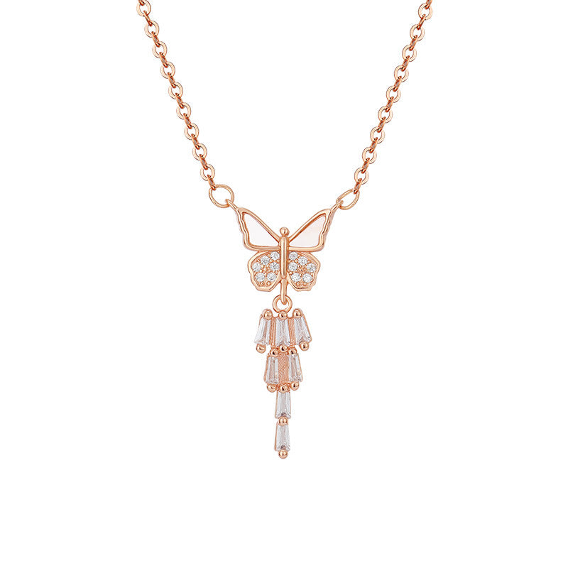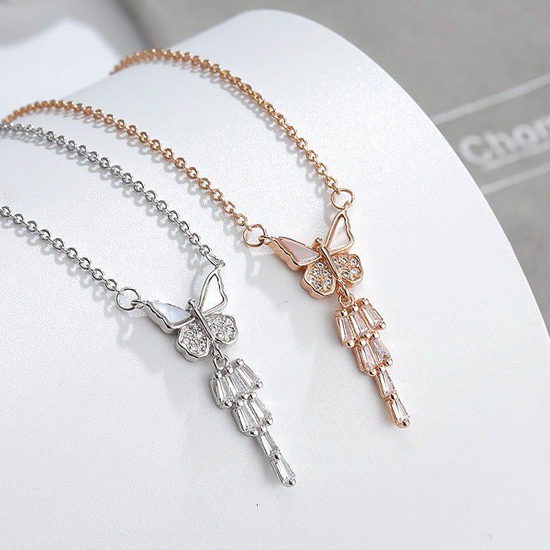 Mother of Pearl Butterfly with Zircon Tassels Silver Necklace for Women