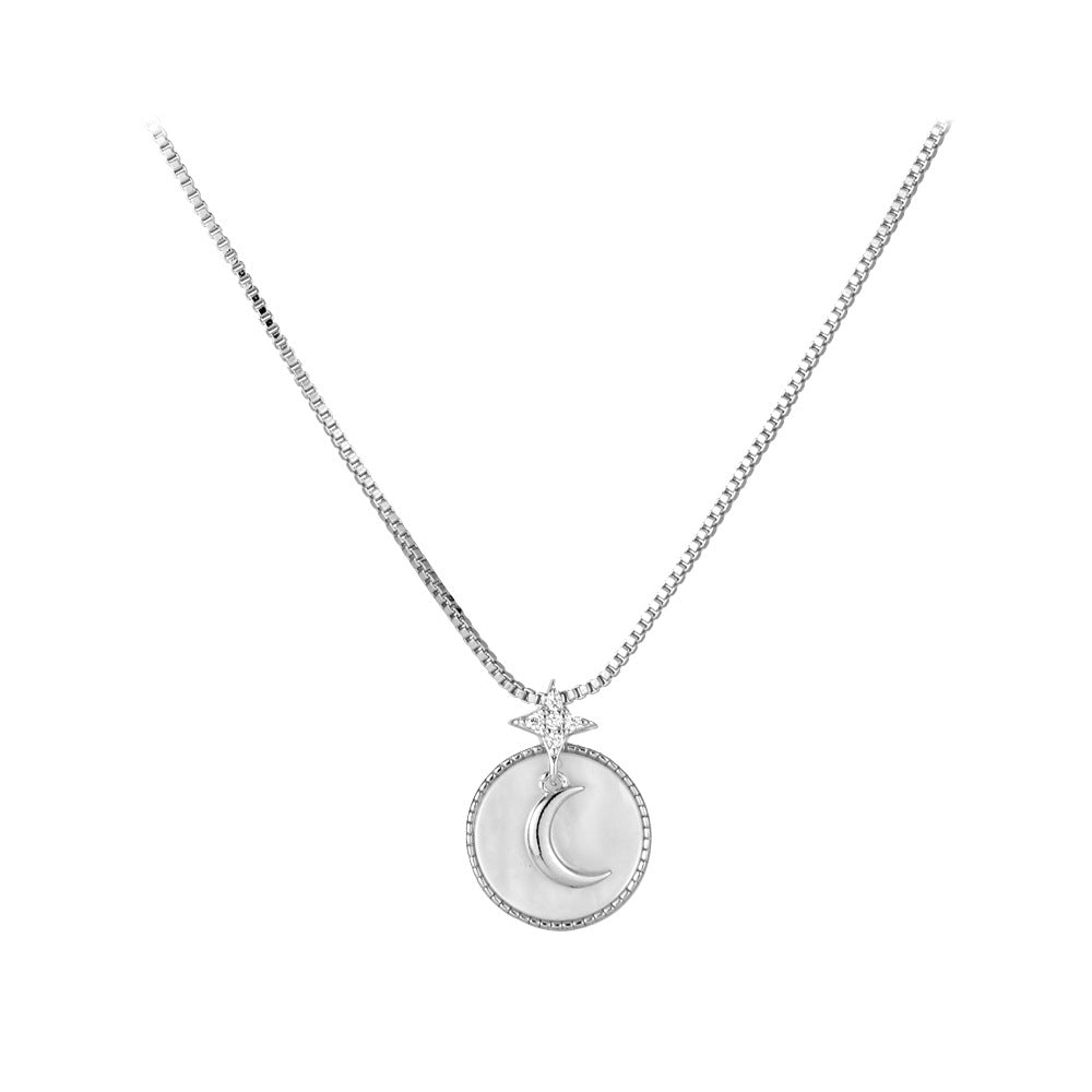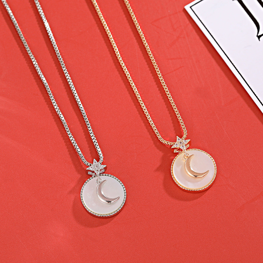 Mother-of-pearl with Moon Star Circle Pendant Silver Necklace for Women
