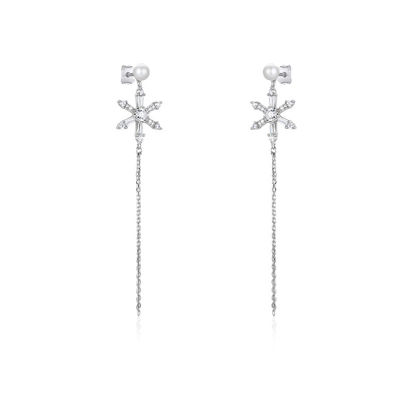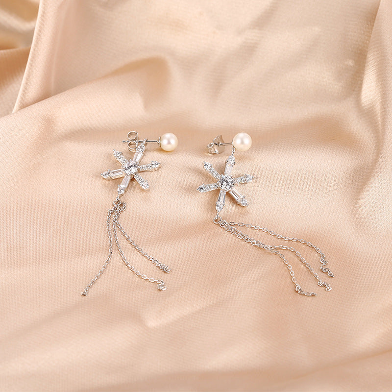 Zircon Six-pointed Star with Pearl Tassel Silver Drop Earrings for Women