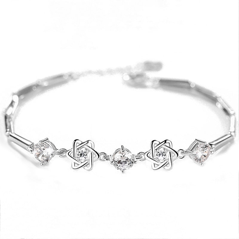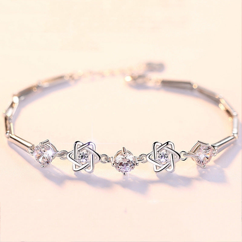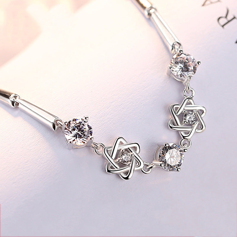This Six Stars with Zircon Silver Bracelet for Women is a luxurious piece to adorn your wrist. Embellished with hexagonal stars and embedded with elegant Zircon, this bracelet radiates a sophisticated charm that is guaranteed to turn heads. Perfect for special occasions or to layer in everyday style.