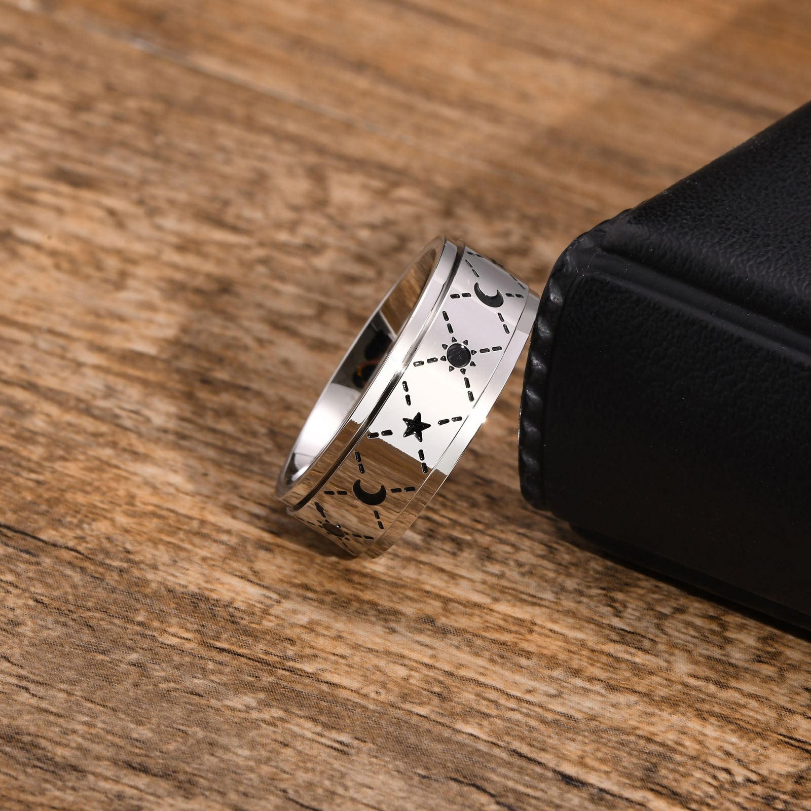 With its eye-catching design and practical features, the Stainless Steel Corroded Sun Moon Rotatable Ring Steel Men's Rotary Ring Index Finger for men is more than just a piece of jewelry—it’s a statement of individuality. Whether you're dressing up for a night out or keeping it casual, this ring complements any outfit, making it a must-have addition to your accessory collection.