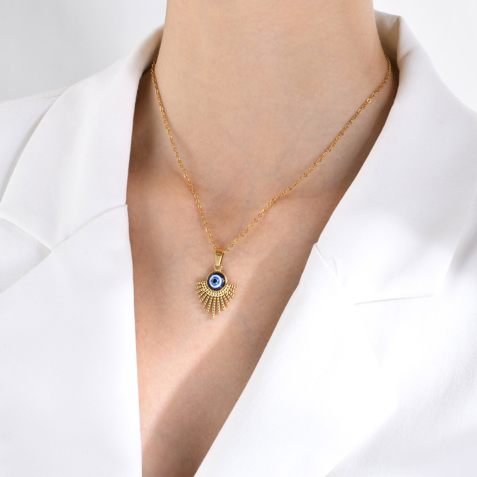 Looking for a charming gift for a loved one? This Stainless steel fan-shaped Devil's Eye gold pendant women's necklace is an ideal choice for birthdays, anniversaries, or just to show someone you care. Its elegant design and meaningful symbolism will surely be appreciated.
