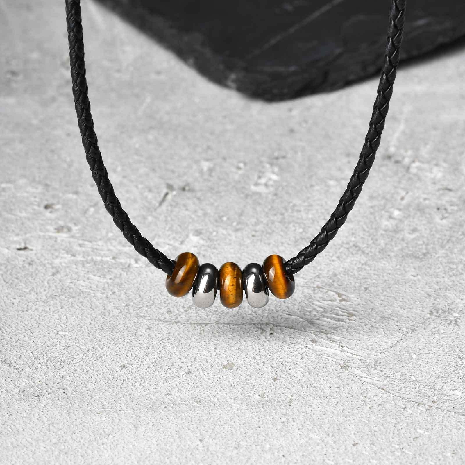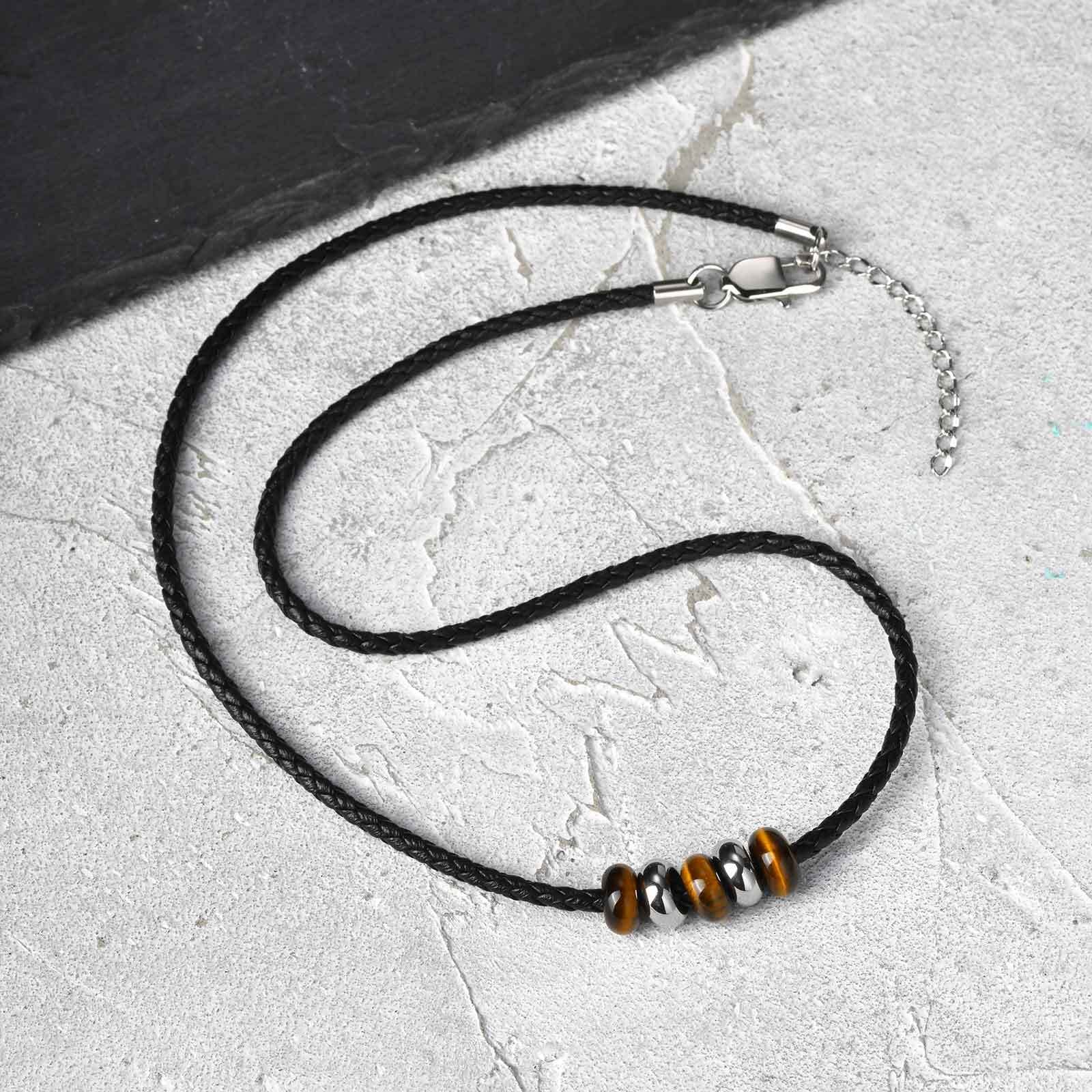 This necklace offers a timeless, versatile silhouette that highlights your personal style without sacrificing comfort. The stainless steel and titanium steel components resist tarnish, while tiger eye beads add a natural focal point in every look. The black PU leather rope provides a comfortable, flexible fit that’s easy to layer with other accessories for a refined, everyday statement.
