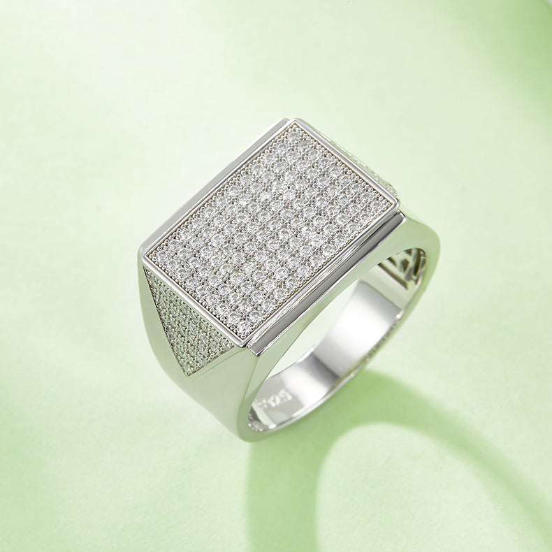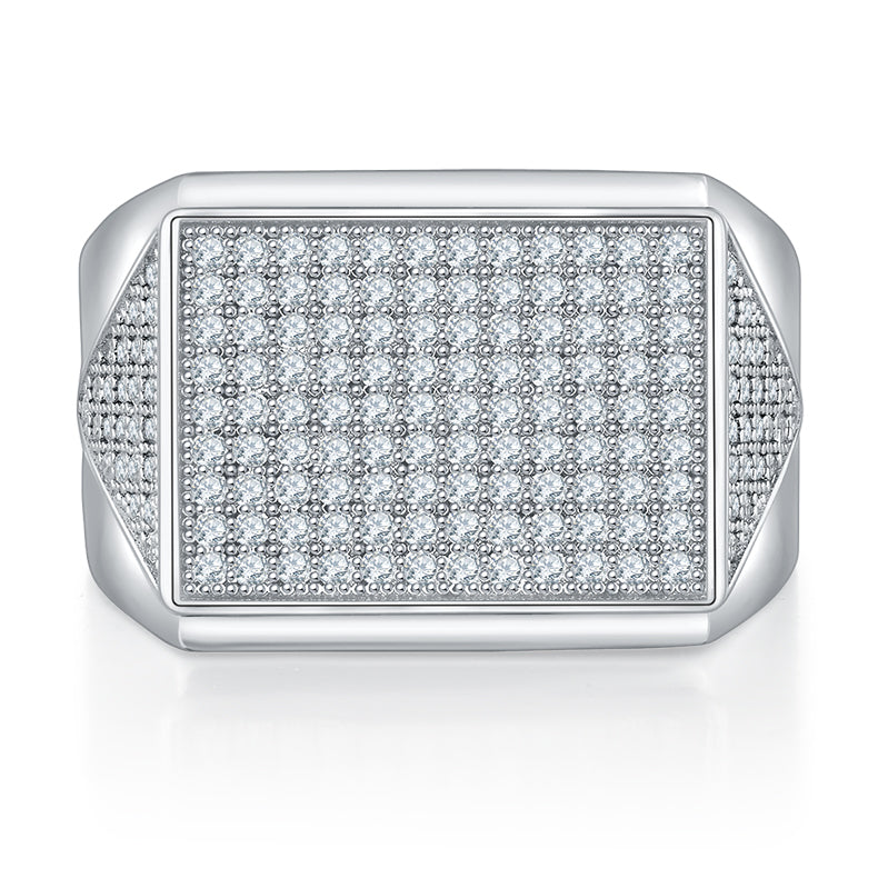 This stylish silver ring is a must-have for the modern man. It features a rectangle decorated with 0.95 carat small Moissanite stones, creating a simple yet sophisticated look. The ring is crafted with high-quality sterling silver for an alluring shine, making it a timeless addition to any wardrobe.