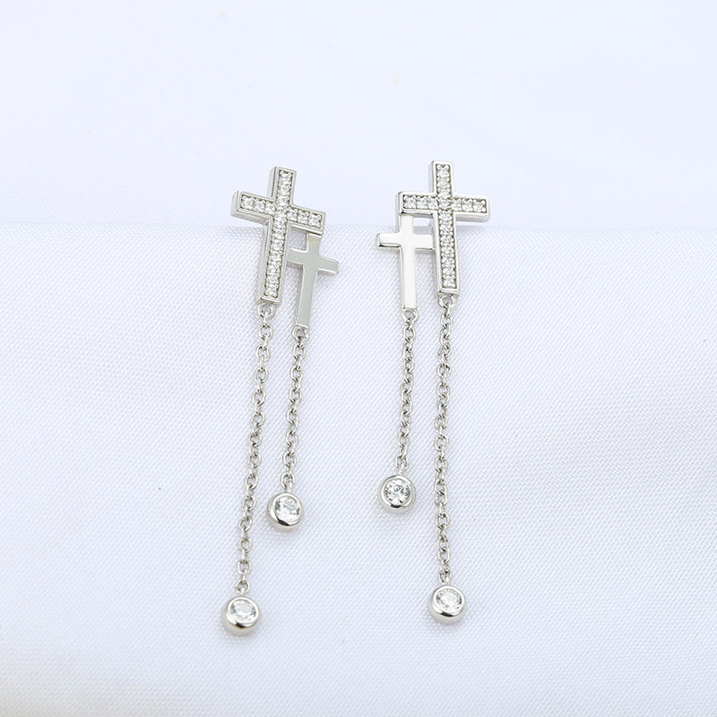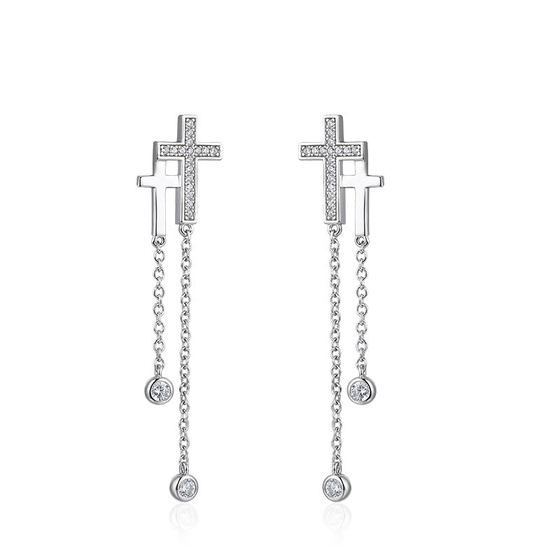 Double Cross Tassel with Zircon Silver Drop Earrings for Women