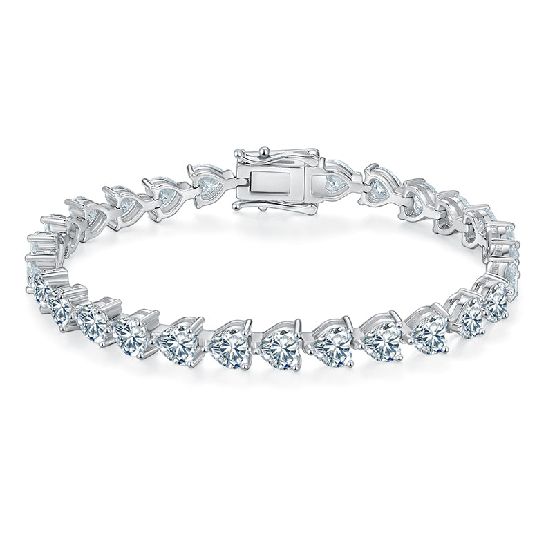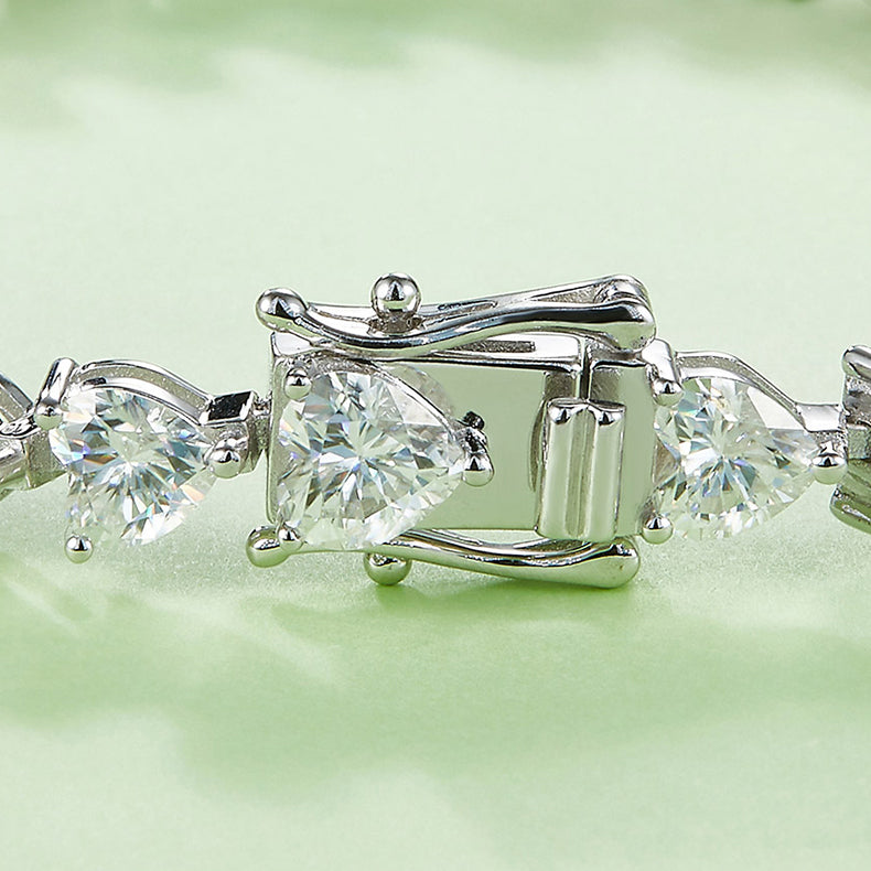 This luxuy Tennis Chain Bracelet is crafted with 0.5 carat each heart-shaped Moissanite stones, creating a delicate and dazzling piece of jewelry. Perfect for special occasions, this exquisite bracelet is sure to make a statement.