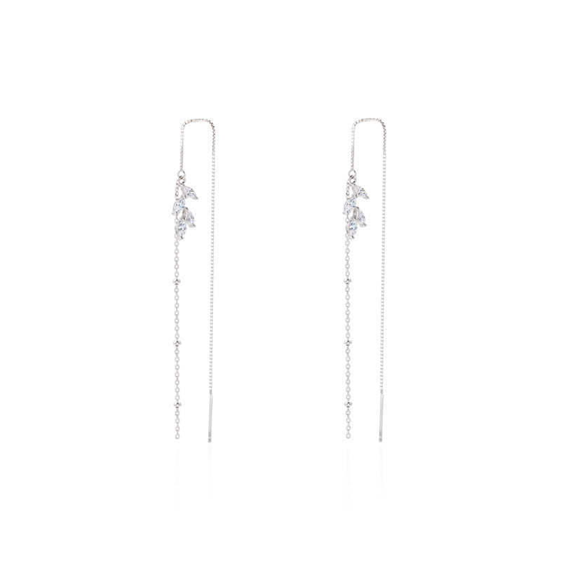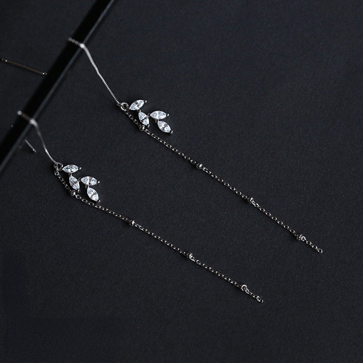 This exquisite earrings feature Marquise Zircon leaves and a tassel design connected with an Ear Line. Crafted from sterling silver, this earrings make a timeless statement for any occasion.