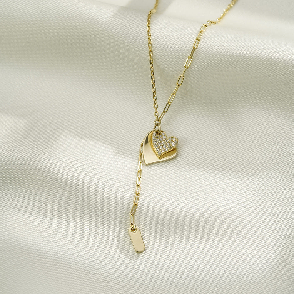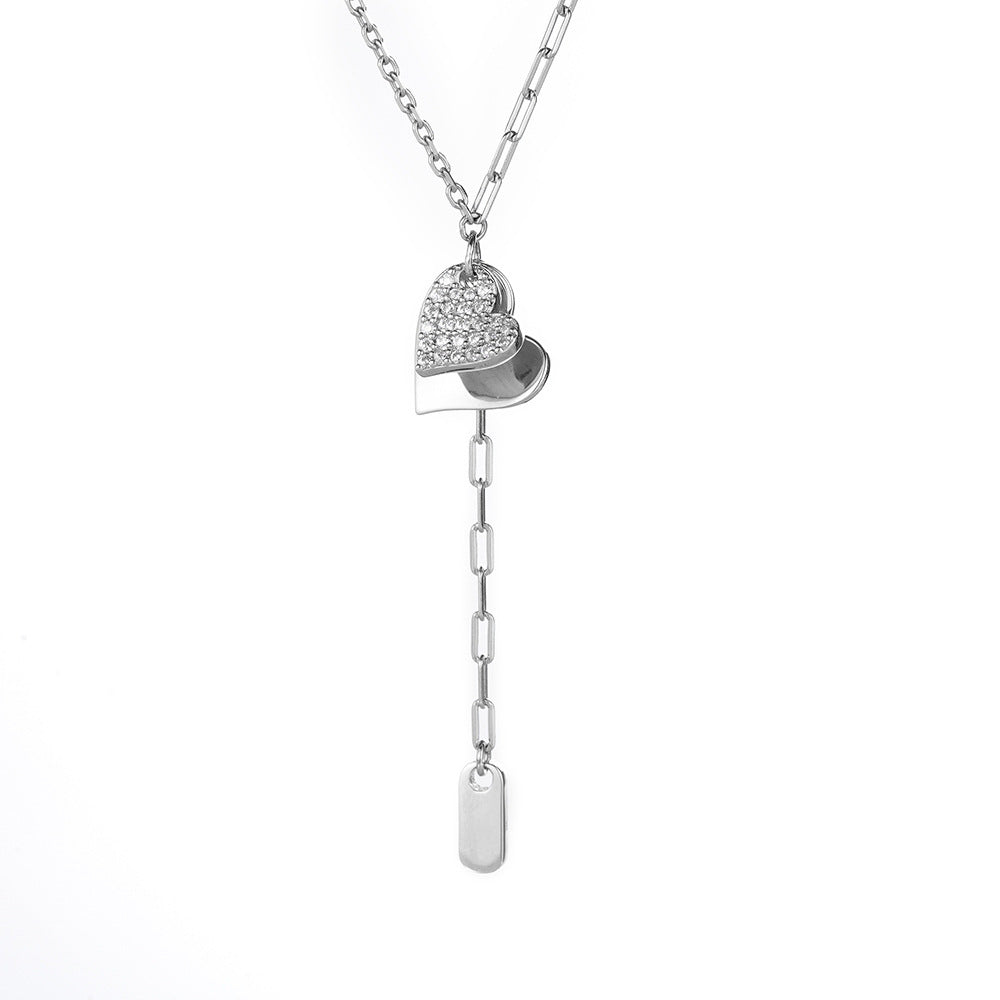 (Two Colours) White Zircon Double Hearts with Tassles Pendants Collarbone Necklace for Women