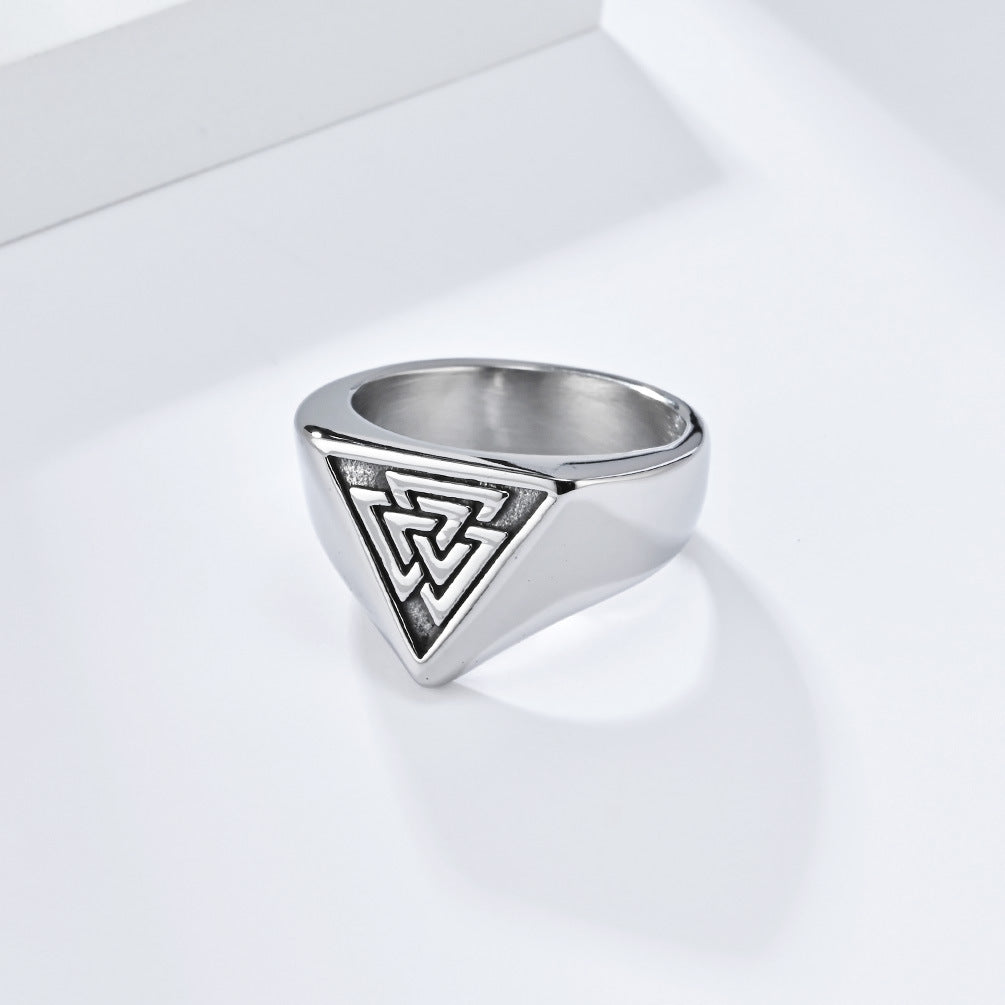 Introducing the Vintage Nordic Germanic Viking Valknute Stainless Steel Ring Ring Odin Triangle Knot Men's Hand Jewelry for men, a stunning piece that combines ancient artistry with modern craftsmanship. Crafted from durable titanium steel, this ring features the iconic Valknute symbol, representing the connection between life and death, making it a perfect statement piece for any Viking enthusiast.