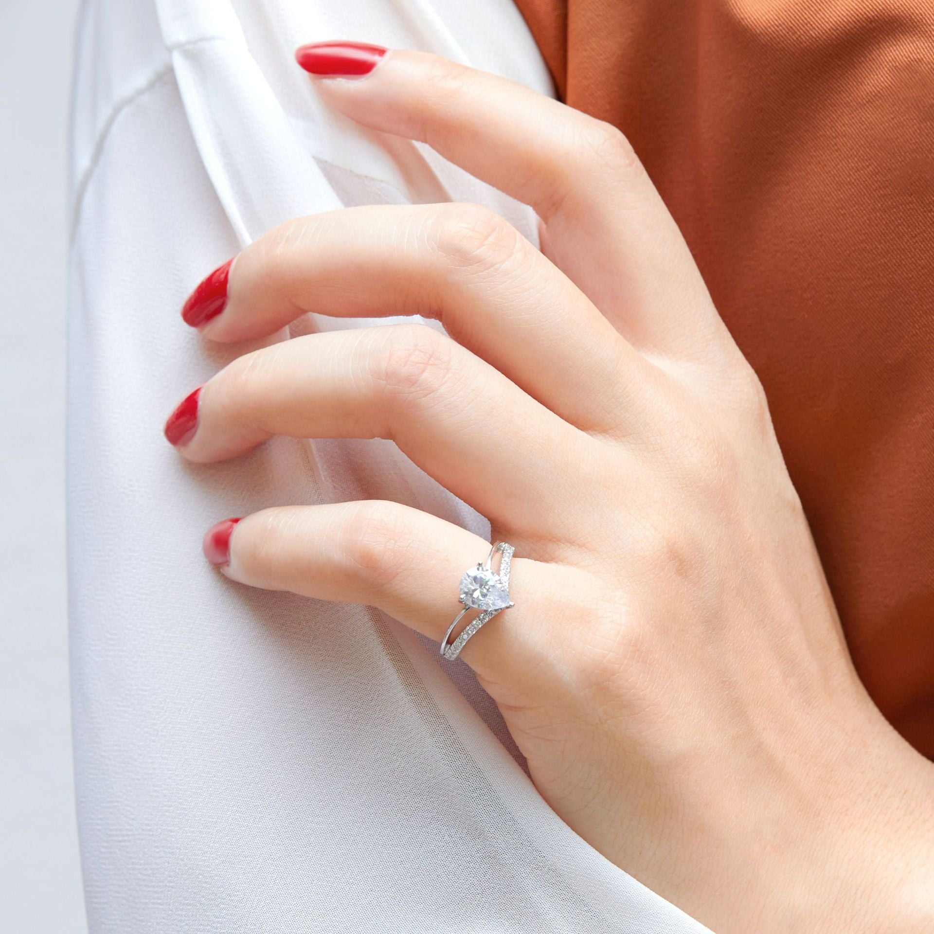 Water Drop Zircon V-shape Modern Split Shank Silver Ring