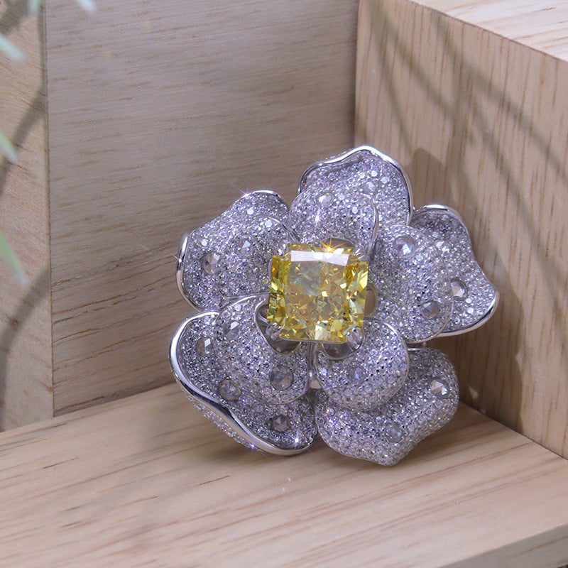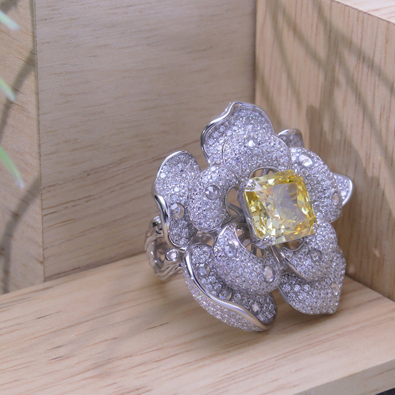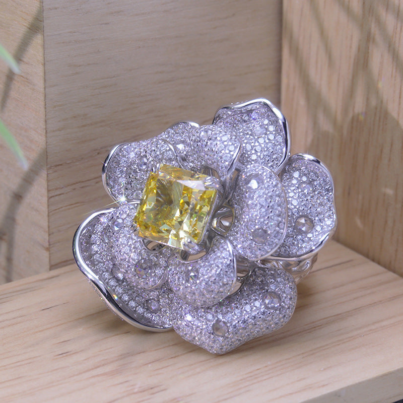 This 10*10mm Cushion Cut Yellow Zircon Luxurious Flower Silver Ring adds an air of sophistication and exclusivity with its intricate flower design, set with a sparkling 10*10mm pink Zircon gemstone. Perfect for accessorizing any special occasion attire, this ring is sure to make a statement.