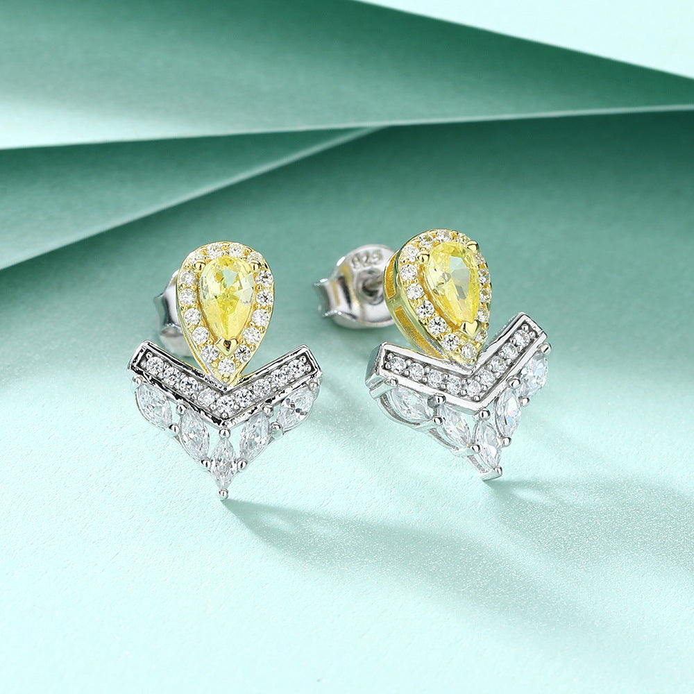 Pear Drop Yellow Zircon V-shape Silver Studs Earrings for Women