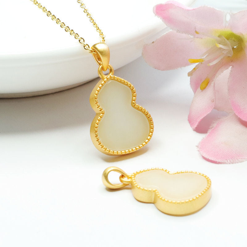 Golden Necklace with Natural Hetian Jade White Gourd Pendant Jewelry