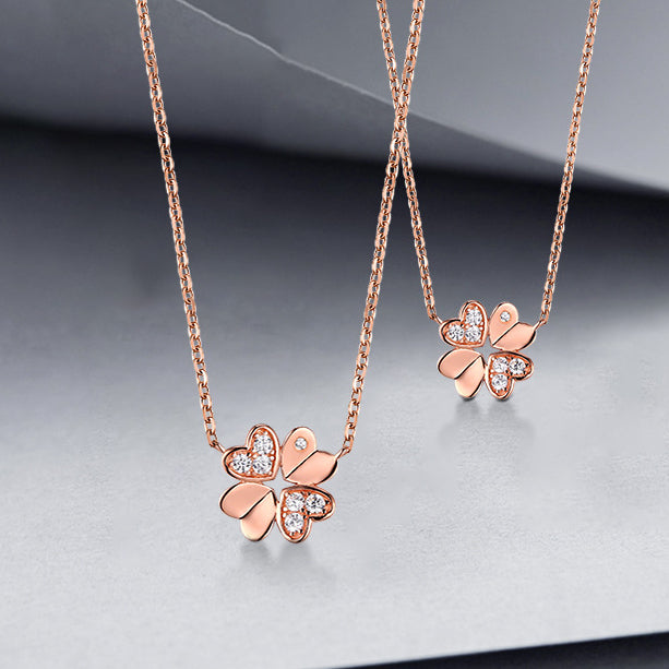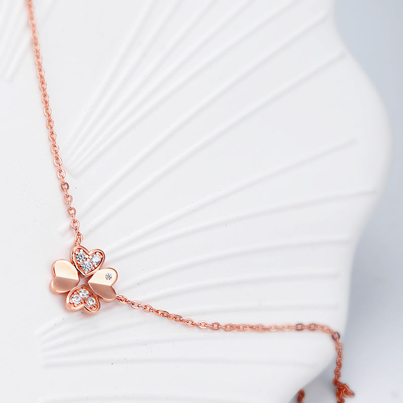 Four Heart-shape Leaves Clover with Zircon Silver Necklace for Women