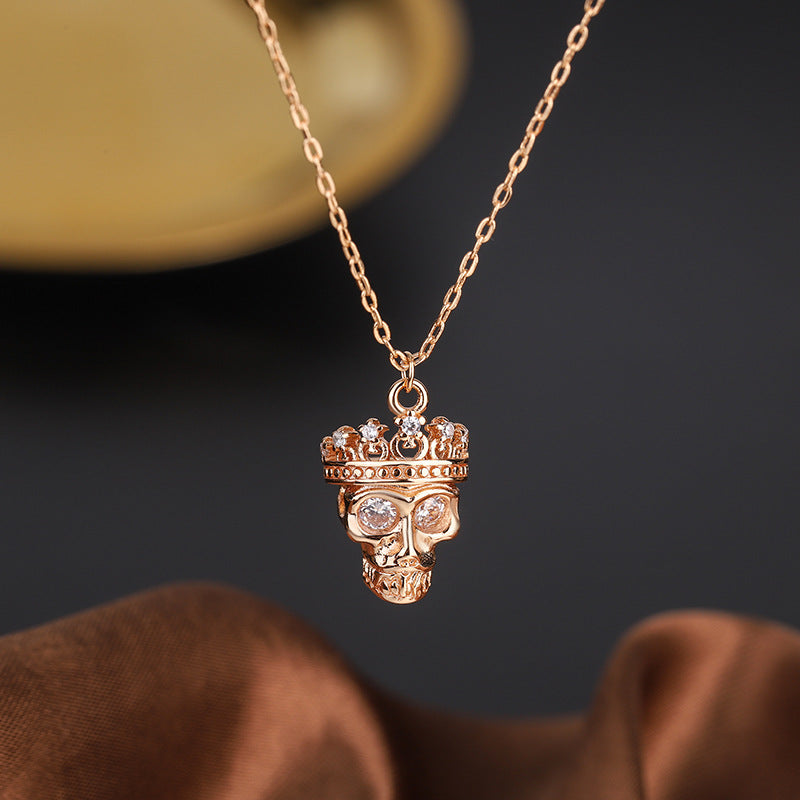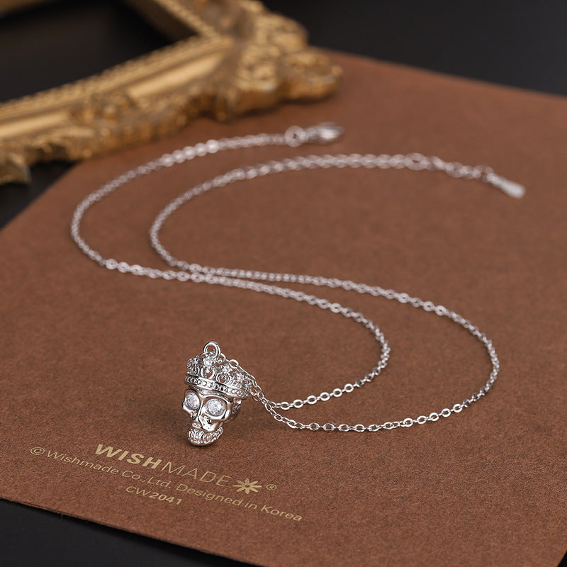 Retro Crown Skull with Zircon Pendant Silver Necklace for Women