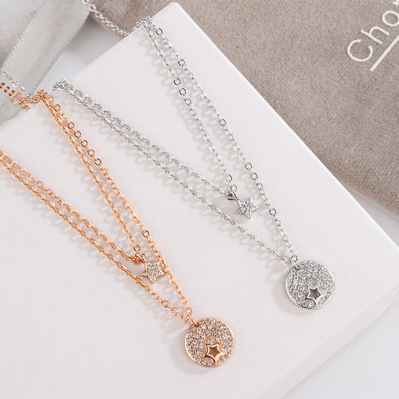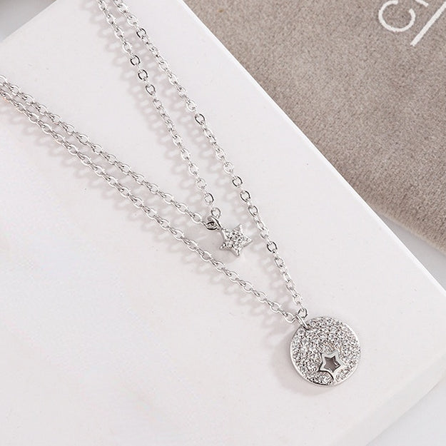 Full Zircon Star Circle Pendant Double-layer Silver Necklace for Women