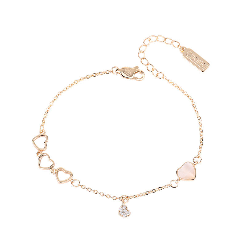This charming bracelet is an elegant addition to any outfit. Made of sterling silver and featuring a Heart-shaped Mother of Pearl and a heart-shape Zircon, this timeless piece is made even sweeter with three delicate hollow hearts. Crafted with love, it's sure to make a unique and special gift.