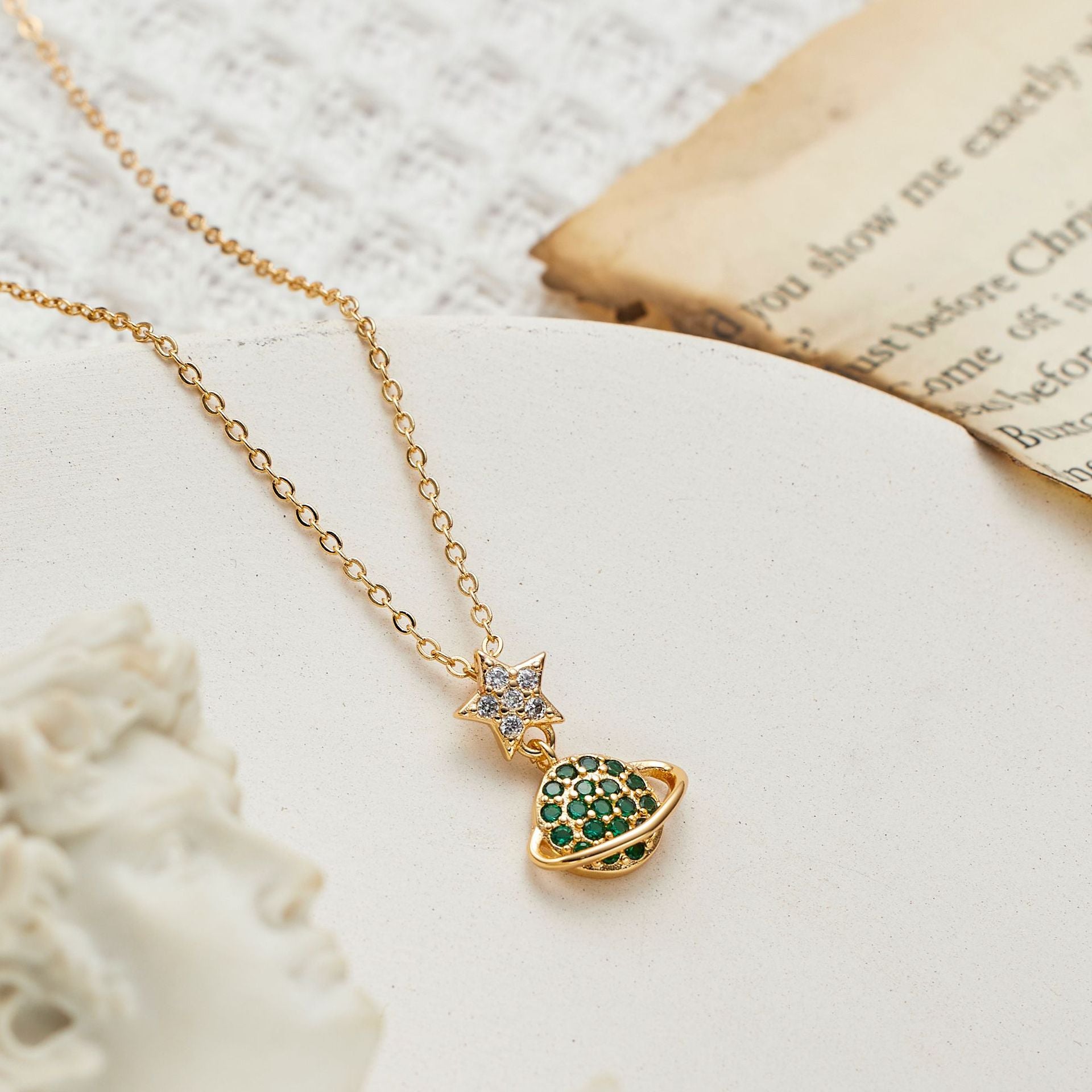 Green Zircon Planet with Star Pendant Silver Necklace for Women