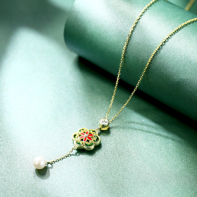 Black Agate Flower with Zircon Tassel Pearl Silver Necklace for Women